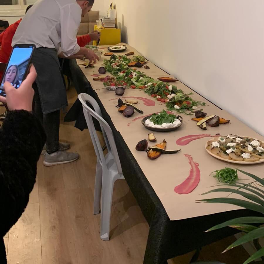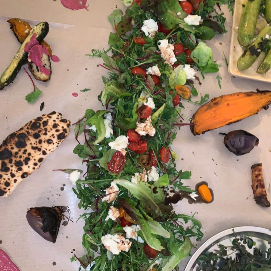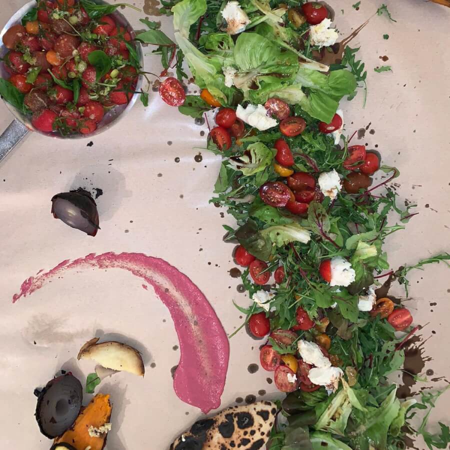 - סלט קפרזה לאורך השולחן אורוגולה עלי בייבי סלנובה עגבניות שרי מוצרלה בלסמי מצומצם וויניגרט חומץ בן יין לבן
