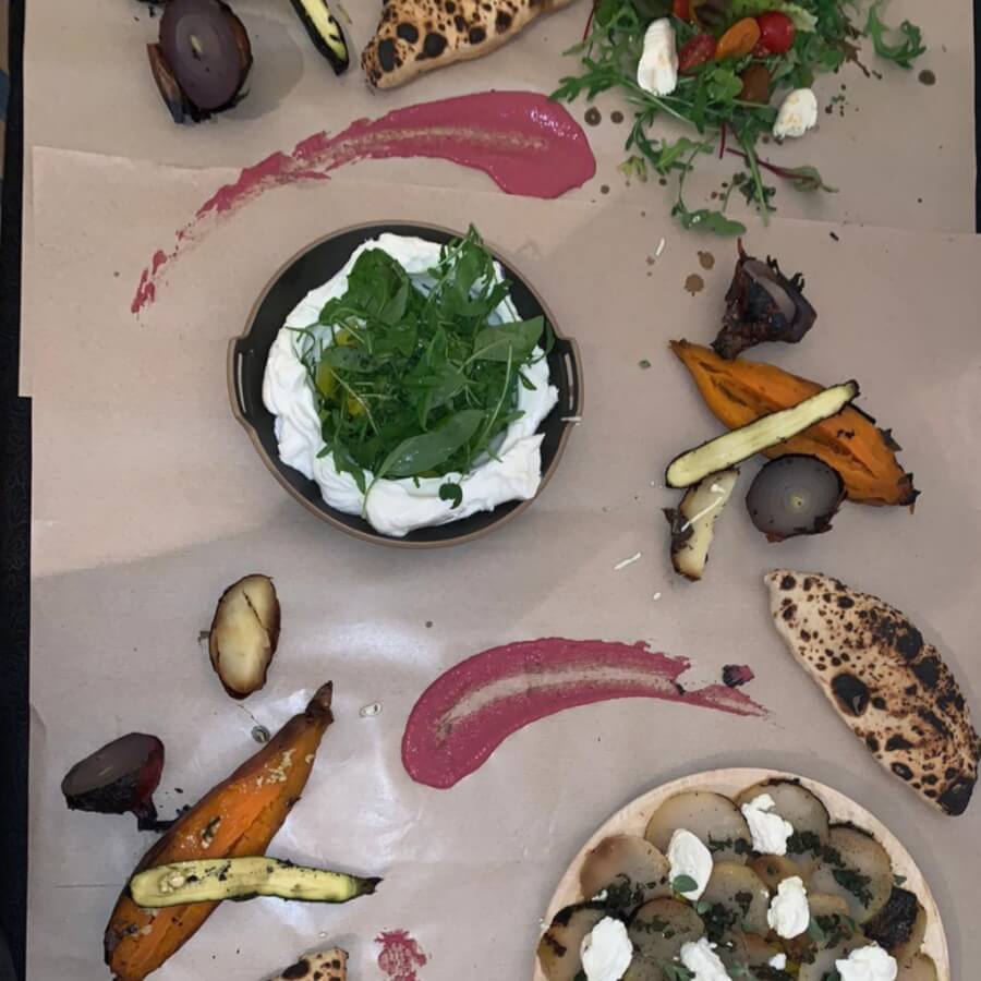 - ירקות שורש צלויים בטאבון גבינת עיזים שרופה פלפל ירוק בורונאזים שום בצל סגול קצוץ