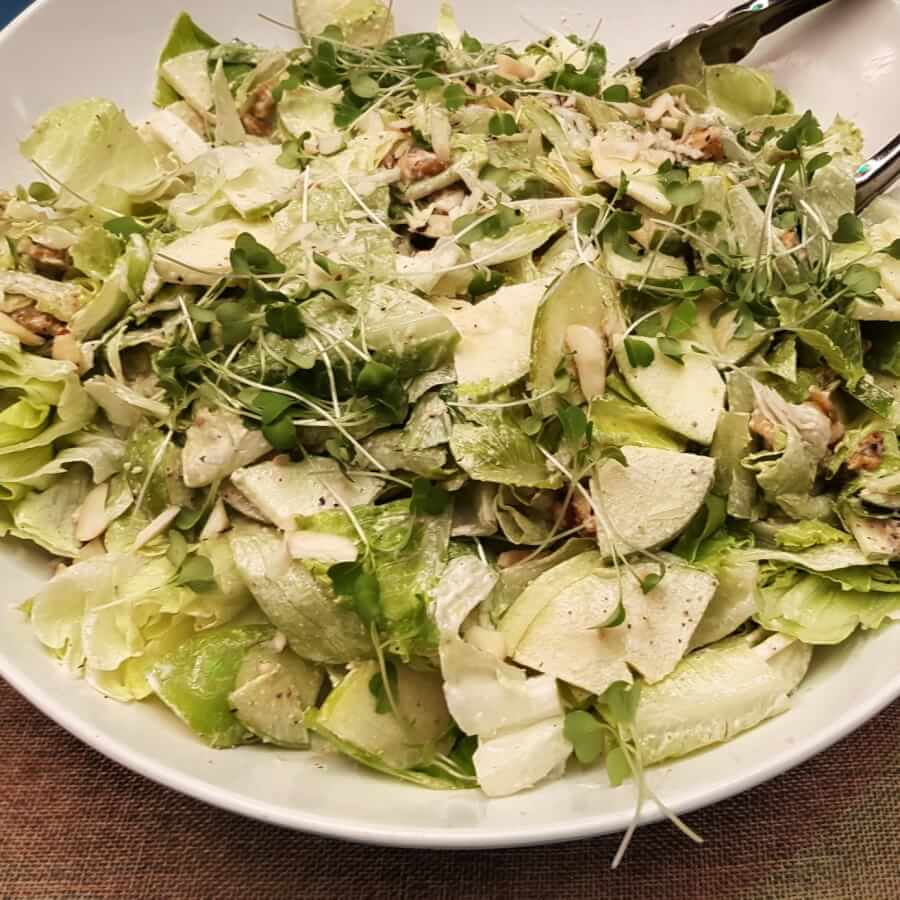 - מיקס חסות – חסה רומית , אייסברג וסלנובה, תפוח עץ גרנד סמיט, אגוזי מלך וצימוקים באיולי אגוזי לוז ומיקס פיצוחים.