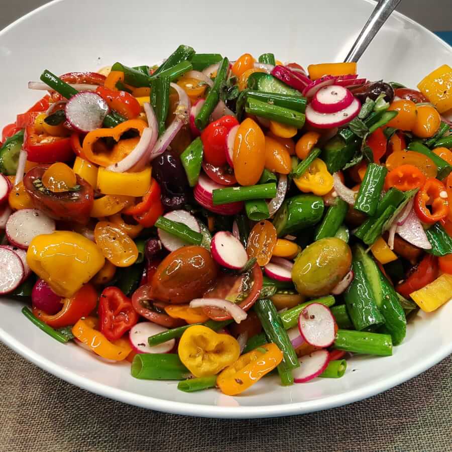 - סלט שוק עם מבחר עגבניות שרי, פלפל טינקרבל ,צנונית,אגוזי מלך,