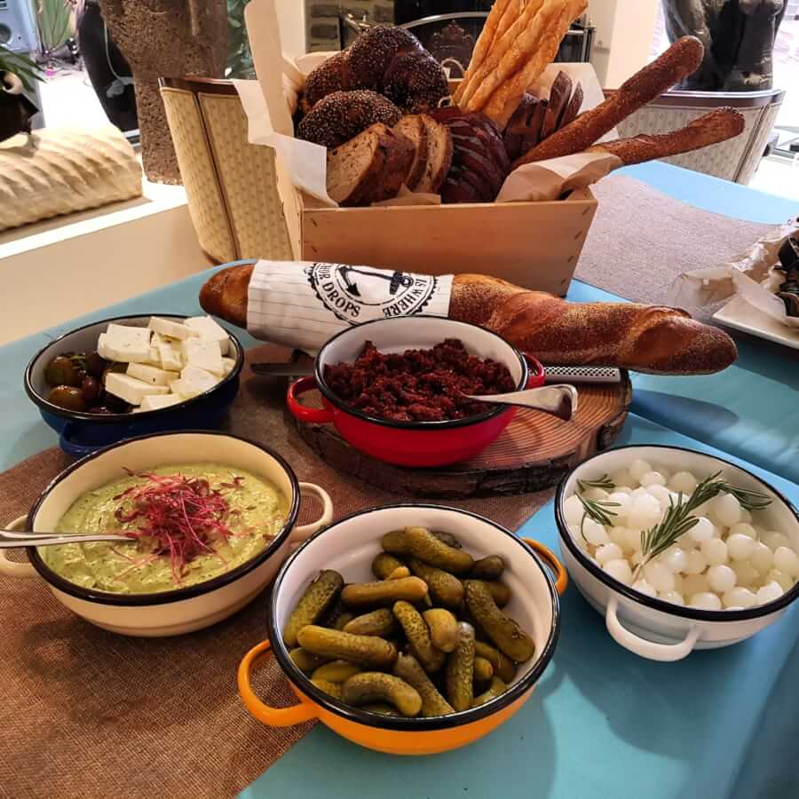 טפנד זיתים , ממרח עגבניות מיובשות, איולי שום קונפי, טחינה הדרים ,איולי פסטו, קורינשונים ובצלצלי פנינה,חמאה צהובה ,