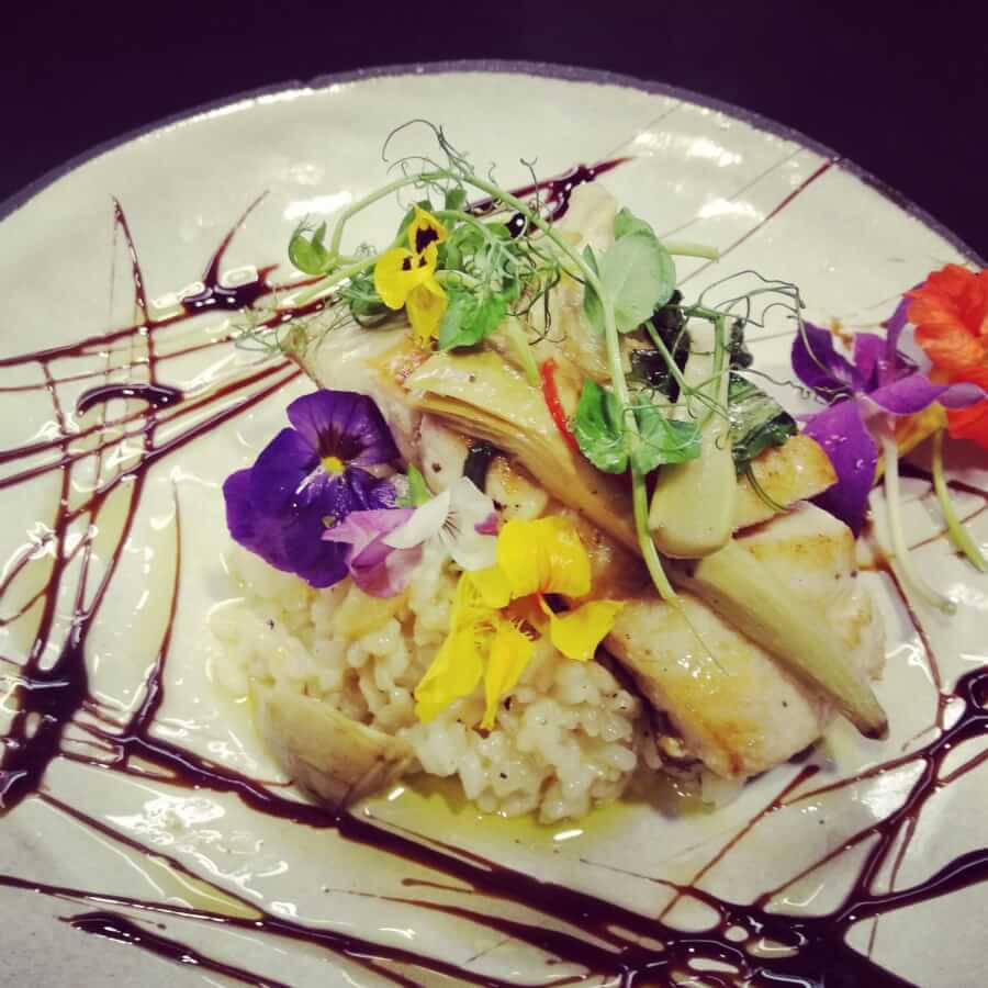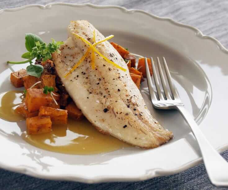 - פילה דג בורי צרוב על הפלנצה מוגש עם רוטב שום ויין , קרם לימון כבוש ,וקרם סלק צלוי.