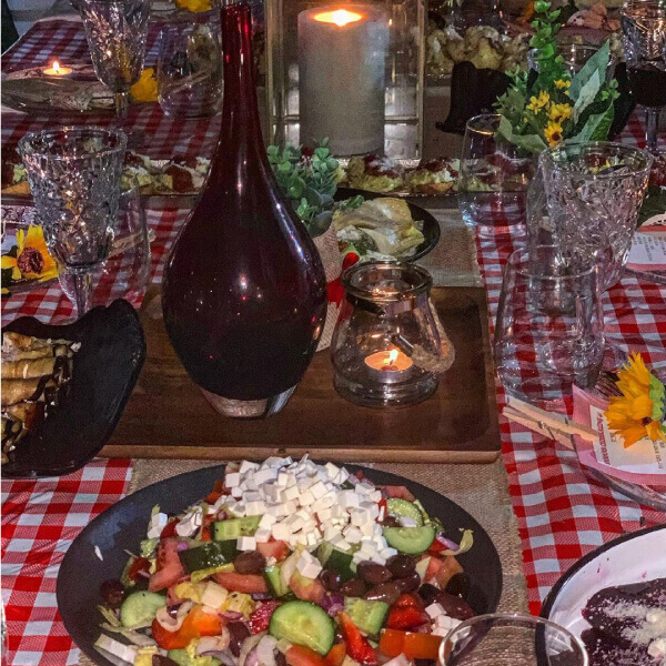 חסה אייסברג עלי אורגולה מלפפון צנון עגבניה פטריות בתיבול לימון שמן זית מלח פלפל.