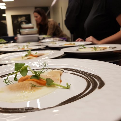 • קרפצ׳יו חציל חצילים קלויים, טחינה, לימון, שמן זית, שום קונפי ועלי אורגולה.