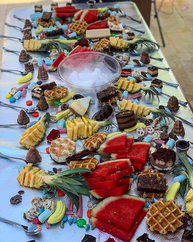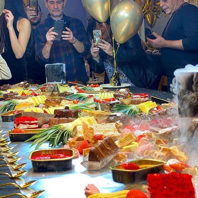 קרם לוטוס מעל כל הקינוחים, קרח יבש בשביל השואו והכל פרווה, מעוצב ומסודר בתוספת שוקולדים על השולחן