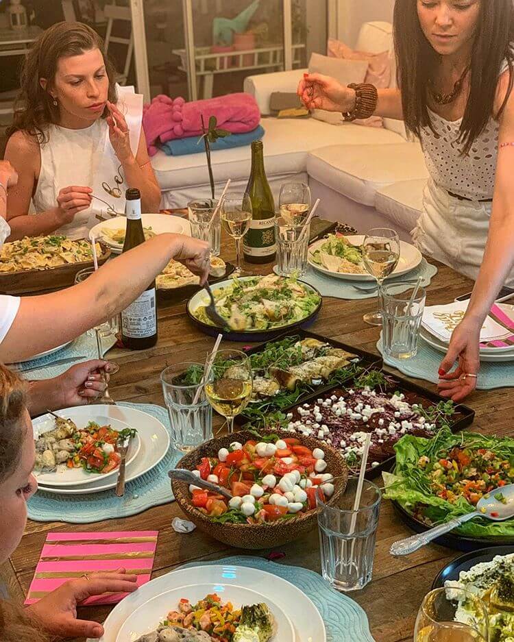חסה אייסברג עלי אורגולה מלפפון צנון עגבניה פטריות בתיבול לימון שמן זית מלח פלפל.