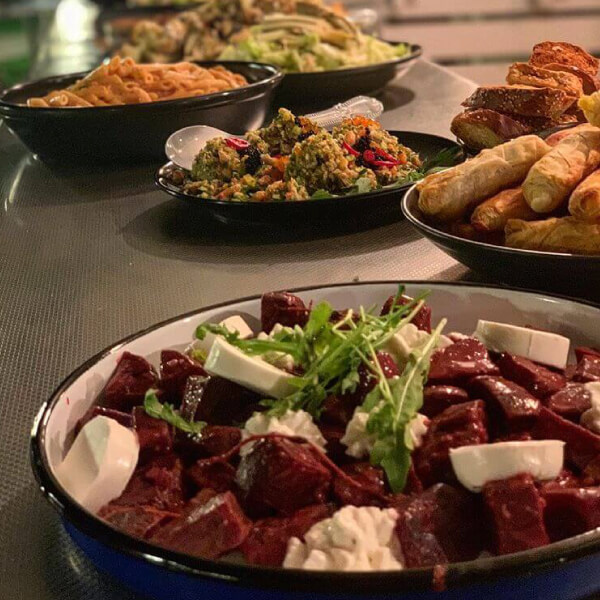 מלפפון נבטי חמניה סלק עלי אורגולה גבינת עזים טמין, תיבול לימון דבש מיץ רימונים.