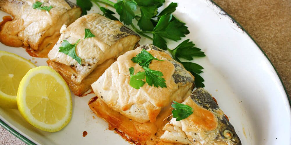 | לערבב את כל החומרים בתבנית, לשים את הדג שלם למרוח אותו טוב מכל הצדדים ולהשרות אותו עם החומר למשך שעה. לחמם תנור לחום גבוהה ולאפות את הדג עד שמתקבל צבע זהוב. |